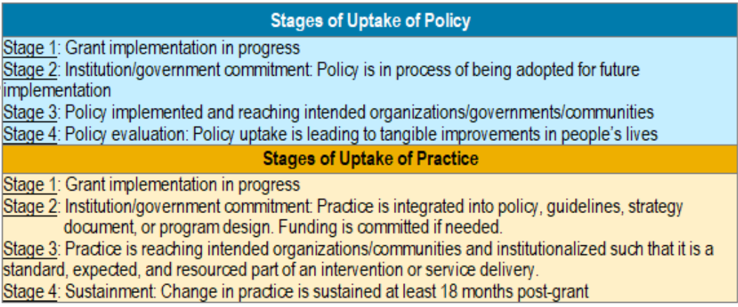 1. Stage of uptake: The extent to which policies or practices are implemented, institutionalized, and sustained (for at least 18 months) post-investment. Institutionalization occurs when policies, practices, and interventions are embedded within the structures and norms of institutions such as government, health facilities, or organizations. These are assessed using a rubric that describes each stage of progress qualitatively.